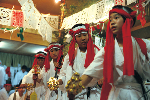 「将来、子どもたちが大きくなって、よその土地に出て行ったとしても、また帰ってきて夜神楽を舞ってほしい」![]() 子どもたちの、ひたむきな頑張りが目を引く。 |